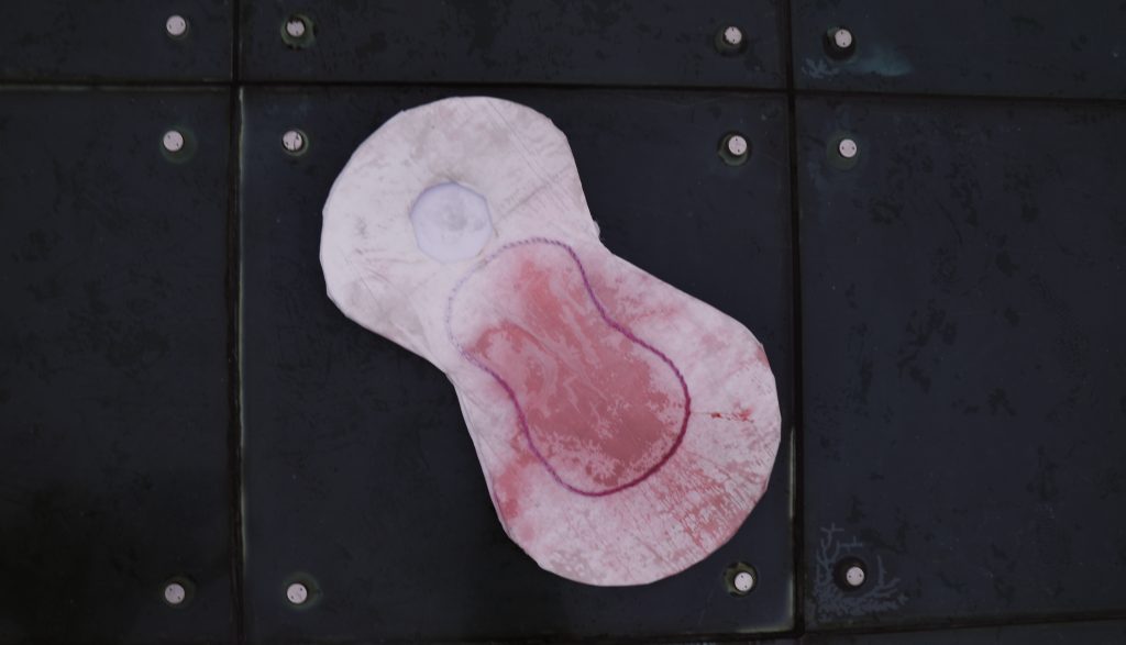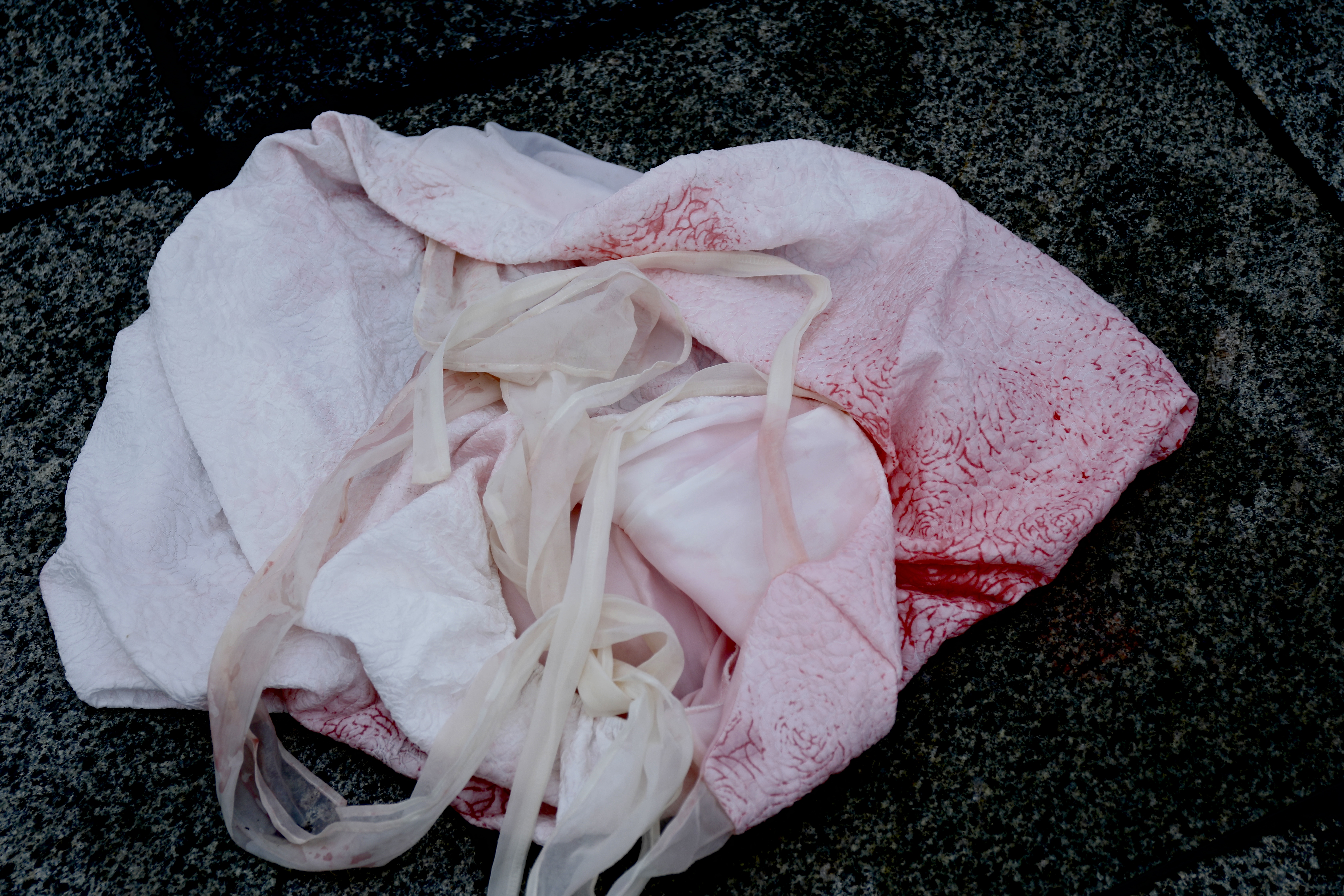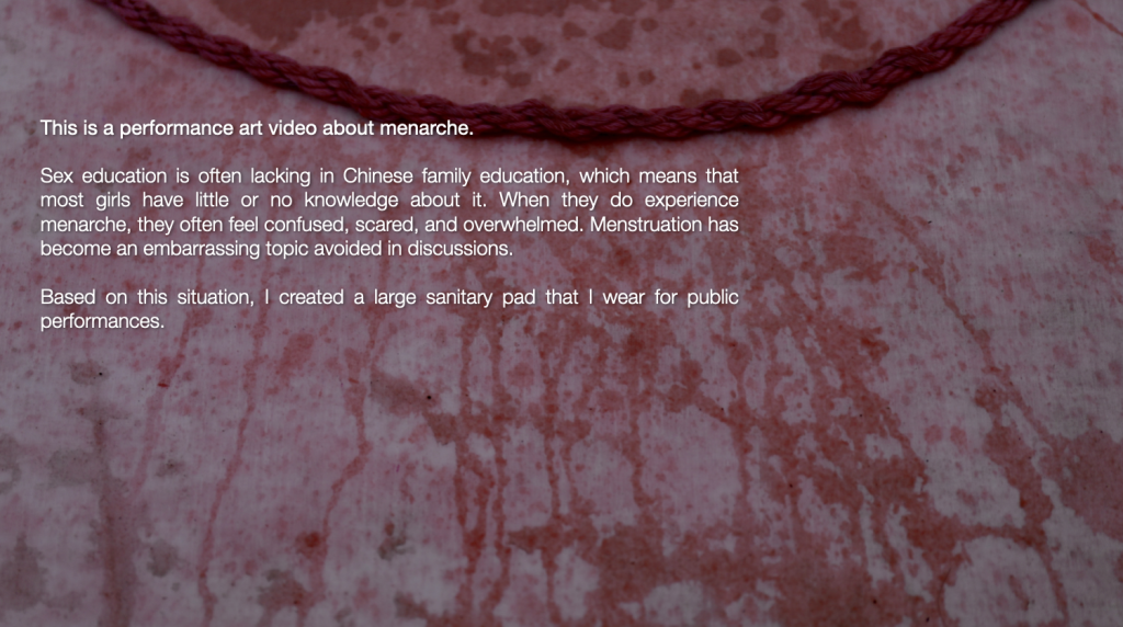 Through these two experiences, I gain an understanding. “I know it now”. Finally, I return the blood-soaked pad to its original position and walk out of the circle. This circle represents not only the menstrual cycle but also the cage of social prejudice and lack of sex education. We have to break out of it.