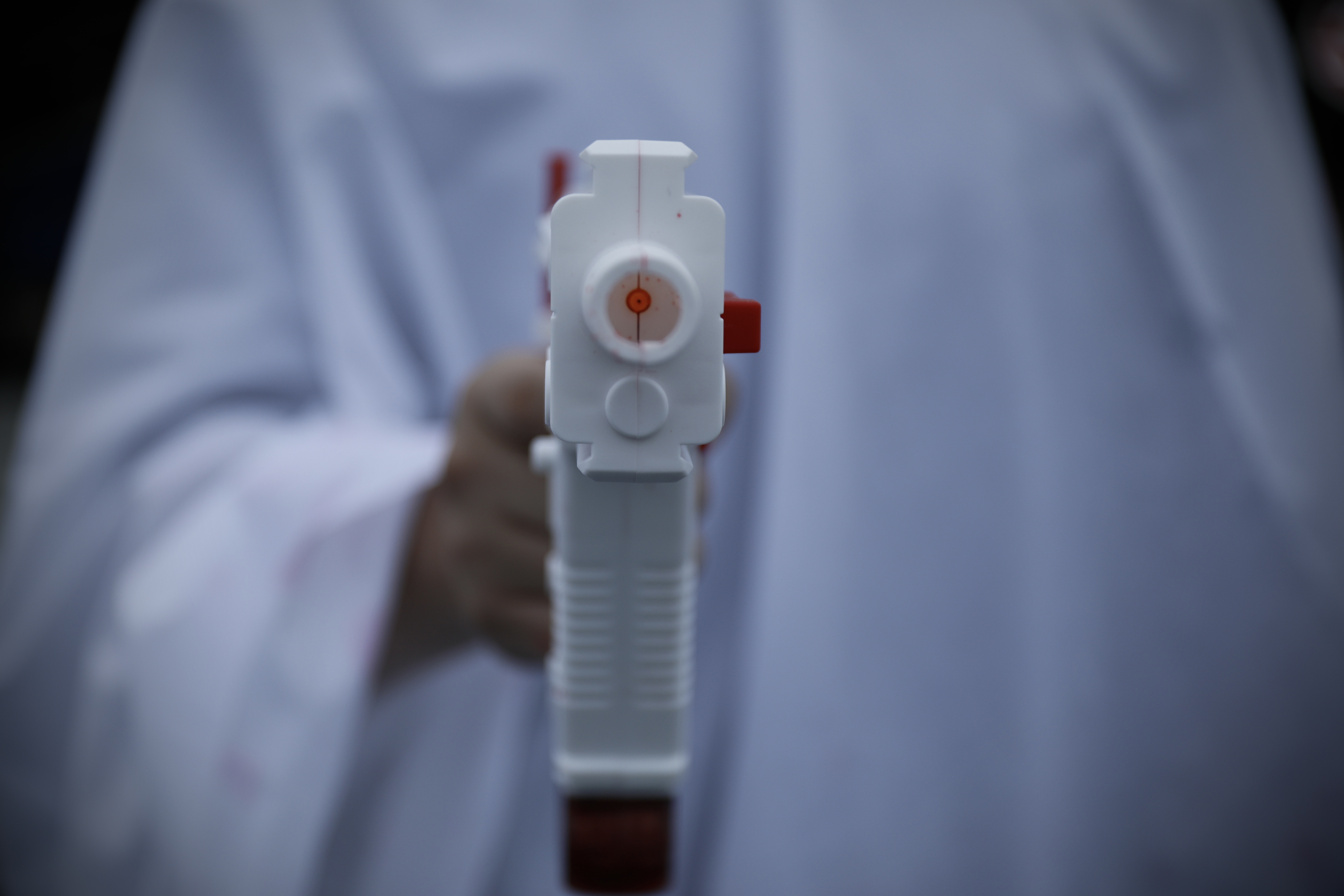 28 people stand in a circle to represent the 28-day menstrual cycle of women, each holding a water pistol.